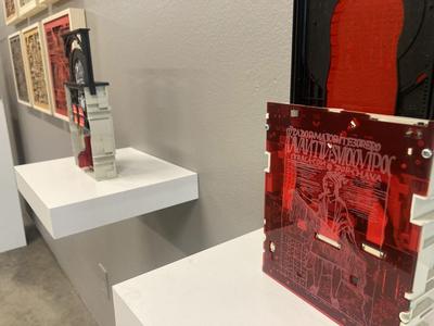 Moving from ancient systems of communication into the modern period, Silva and Silva reference early recording devices and the physical mechanics of storing information. In Gonzalo Silva’s “Wandering Thread” (2025), printed and etched Plexiglass panels reproduce colonial and modern representations of quipus, the Andean recording system composed of knotted cords that likely conveyed both numerical and narrative information.